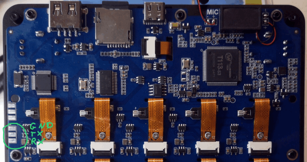 En ouvrant le MK20 on trouve 6 pads sur le coté dont un semble correspondre à l’UART de boot du T113-S3.
